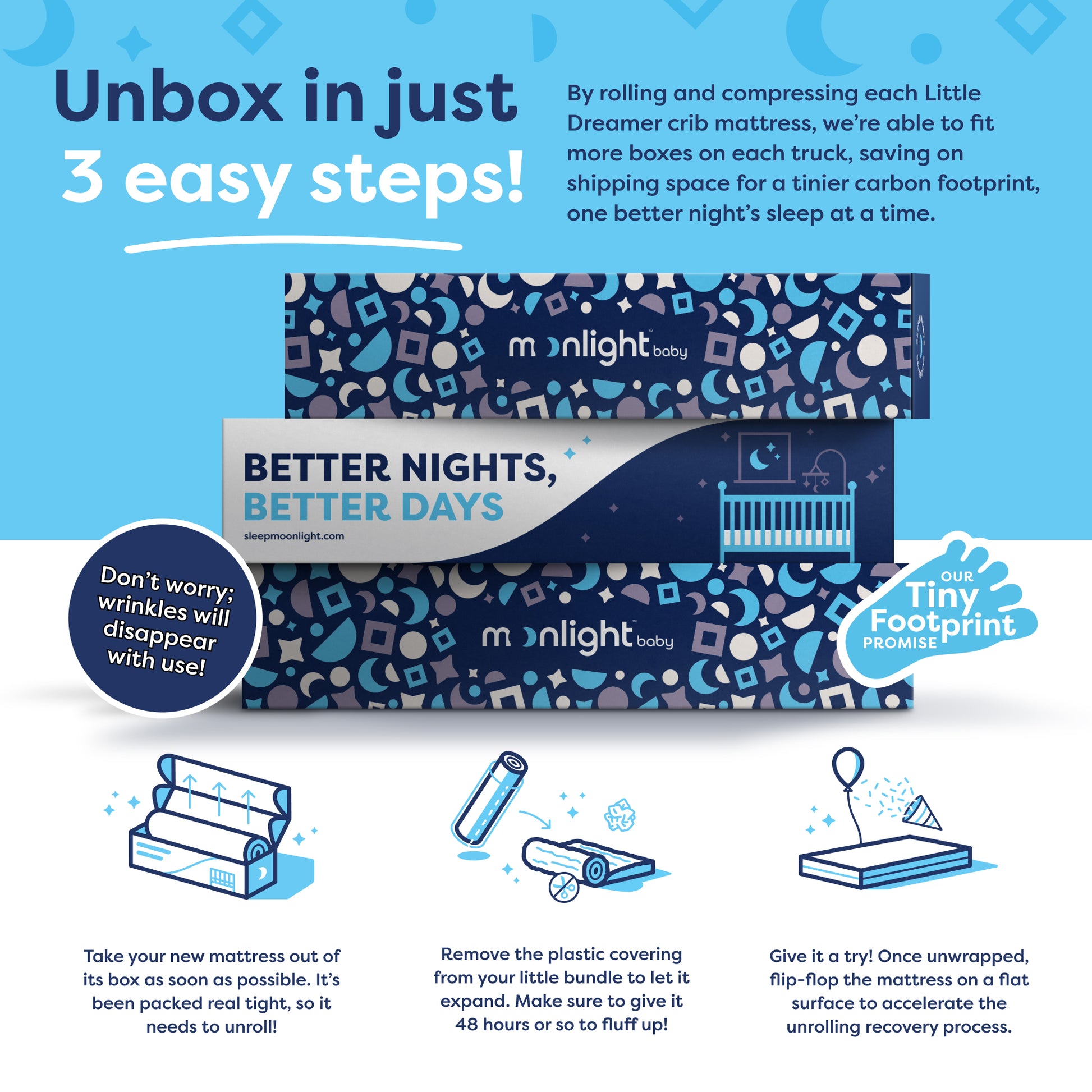 Little babies leave tiny footprints… and so should their mattresses! By rolling and compressing each Little Dreamer crib mattress, we’re able to fit more boxes on each truck, saving on shipping space. This, in turn, helps us lower our carbon emissions! What’s good for baby is good for the planet, too. That’s our promise to you: a tinier carbon footprint, one better night’s sleep at a time!