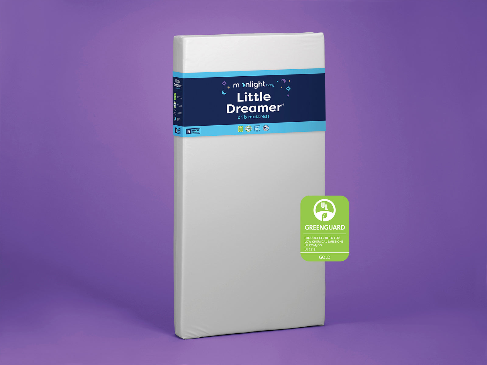 Moonlight crib mattresses are UL GREENGUARD® GOLD-certified, wrapped in a woven fire barrier with no spray-on FR chemicals and protected by reinforced, safesewn seams. This mattress also features CertiPUR-US® certified foam.