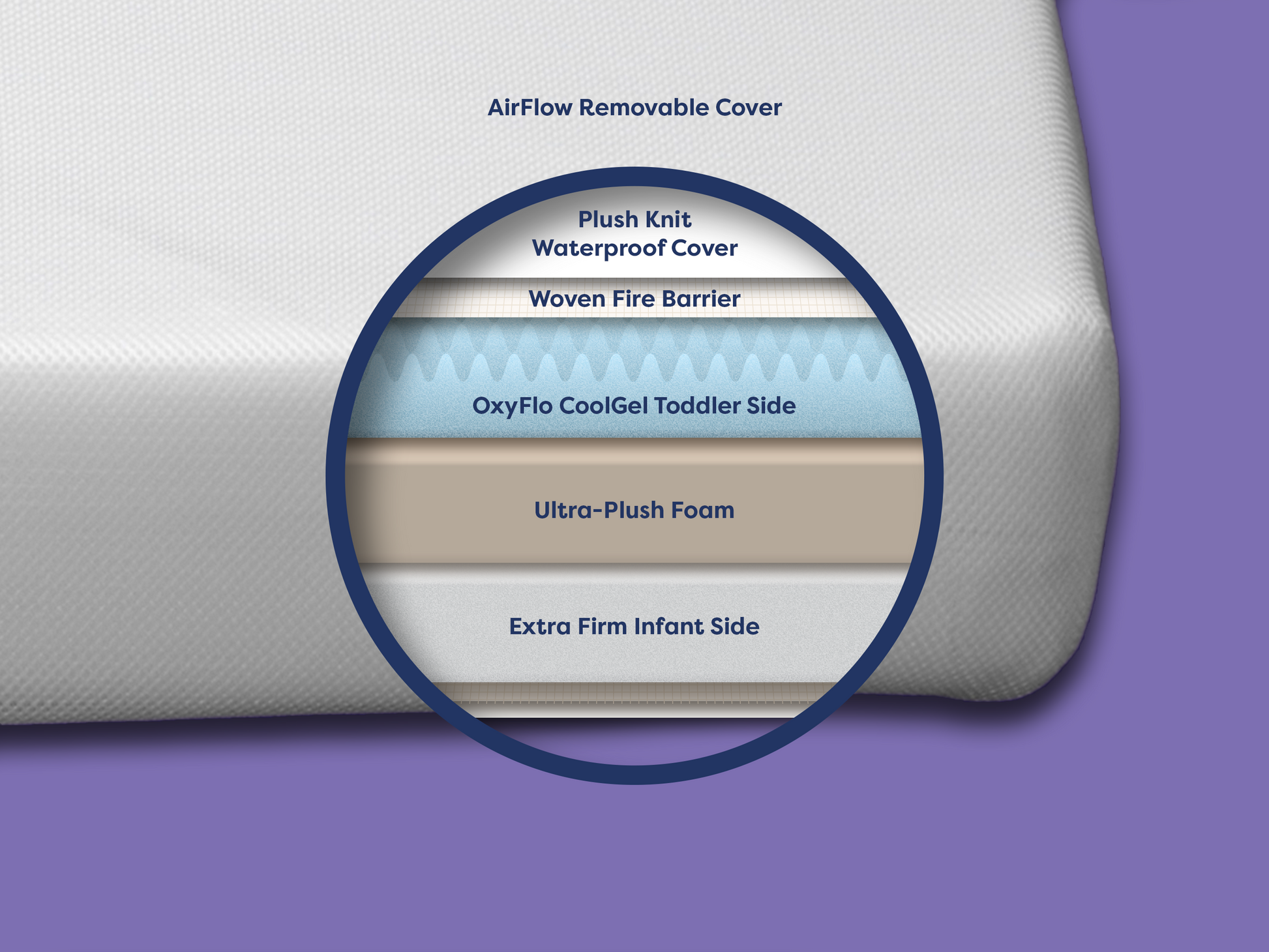 Our 6” dual-sided Luxury Dreamer supports both newborns and toddlers with a high-density infant foam side and corresponding plush foam toddler side featuring a layer of luxurious OxyFlo CoolGel memory foam. Simply switch the mattress when your little one is ready for the next step, using the arrows on the mattress tag as a guide.